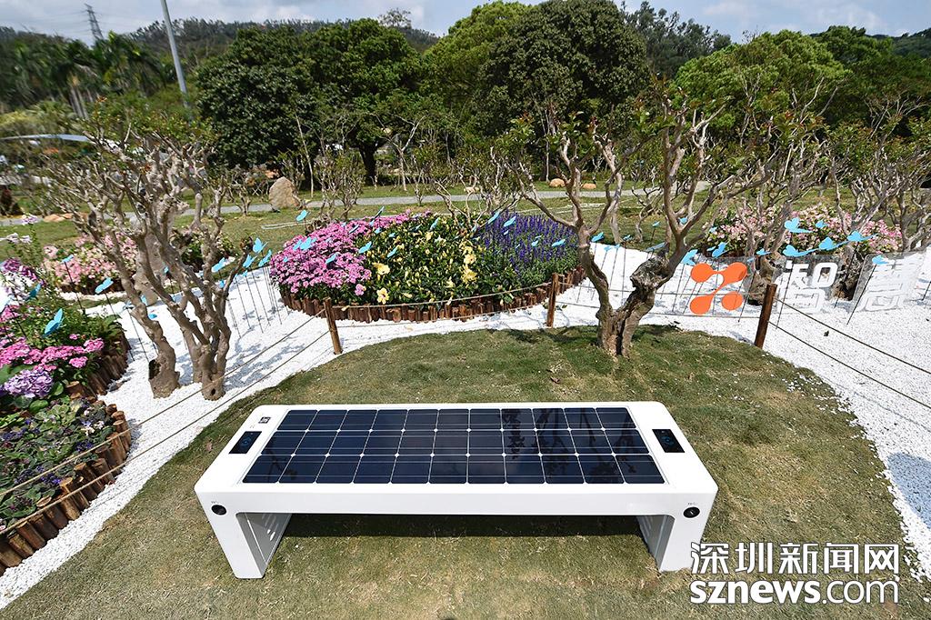 智能座椅被放置在花園中,該座椅利用太陽(yáng)能發(fā)電,可以進(jìn)行無(wú)線和有線充電