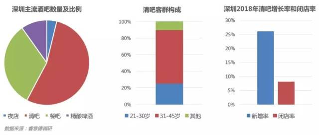 報告著重以夜店、清吧、餐吧、精釀啤酒吧為主要研究對象。其中,清吧的數(shù)量在主流酒吧業(yè)態(tài)中占比過半——2018年,清吧在深圳超過600家,占據(jù)市場的54%,開業(yè)量超過130家,閉店數(shù)則超過40家,精細運營成為追求現(xiàn)象級爆紅的“網(wǎng)紅”酒吧發(fā)展的主要瓶頸。