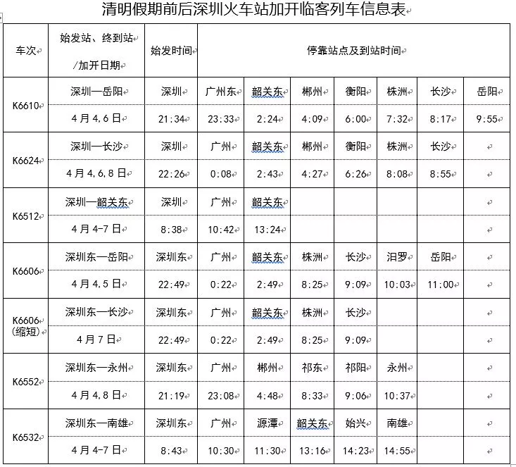 深圳站將加開(kāi)3對(duì)臨客列車,始發(fā)車次為開(kāi)往岳陽(yáng)的K6610次、開(kāi)往長(zhǎng)沙的K6624次和開(kāi)往韶關(guān)東的K6512次;