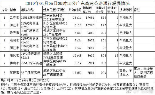 廣東交警部門(mén)此前預(yù)計(jì),從4月4日至7日全省高速公路車(chē)流都將持續(xù)處于高位,出行最高峰出現(xiàn)在4月4日15時(shí)至5日凌晨2時(shí)。4月5日9時(shí)15分,廣東高速車(chē)通行緩慢長(zhǎng)度超過(guò)5公里,時(shí)間超過(guò)30分鐘的路段共8個(gè)。