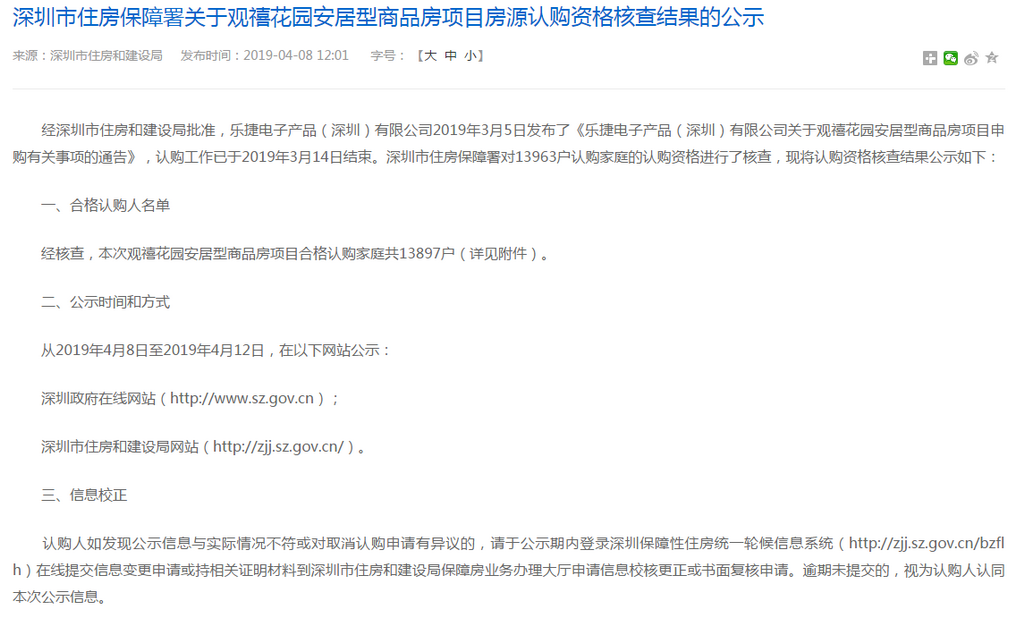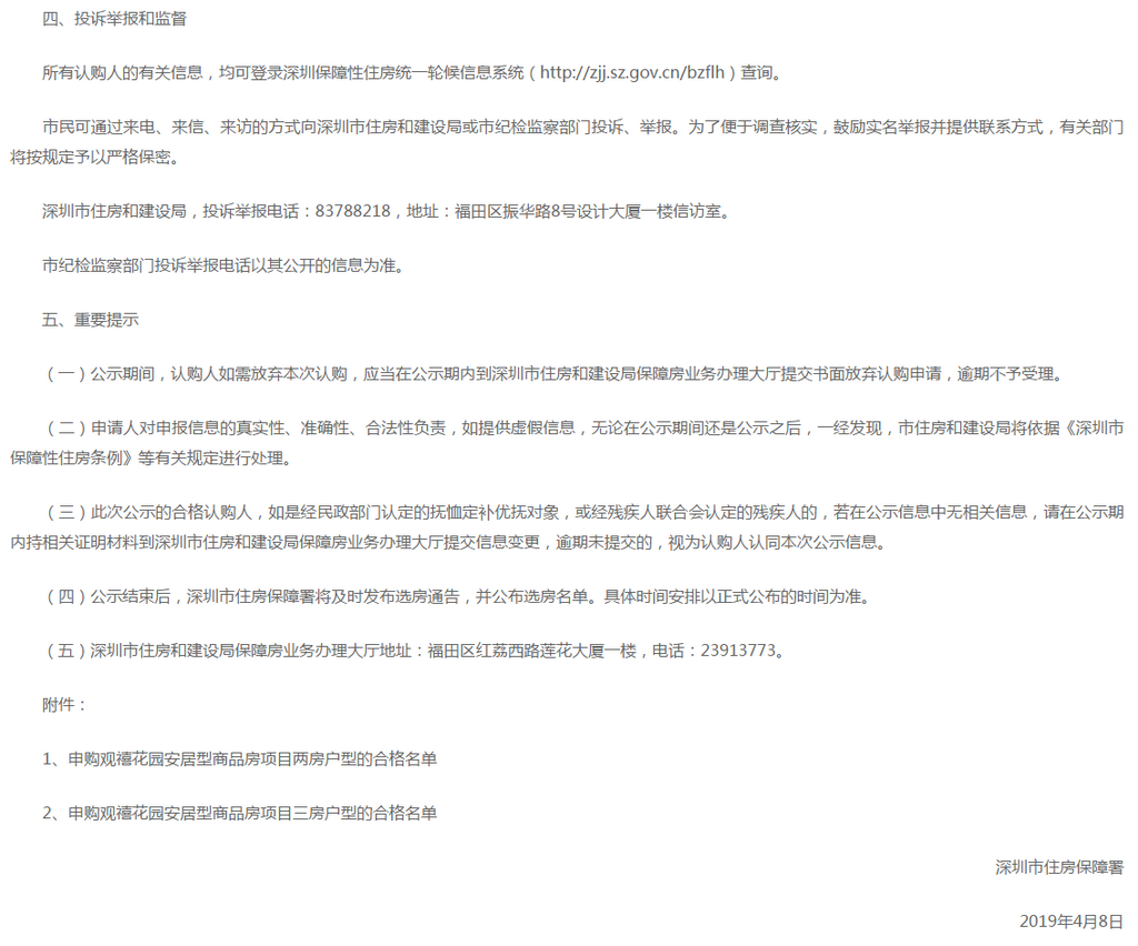 深圳新聞網2019年4月9日訊(記者 劉婷)記者從市住房保障署獲悉,觀禧花園安居型商品房項目認購工作已經結束。經核查,該項目合格認購家庭共13897戶,合格家庭名單自4月8日至4月12日在深圳政府在線和深圳市住房(http://www.sz.gov.cn)和建設局(http://zjj.sz.gov.cn/)網站公示。