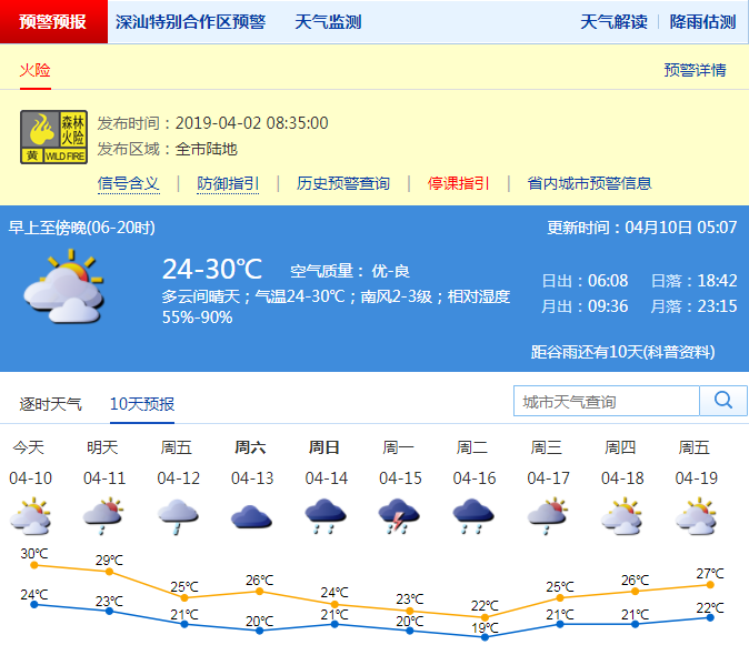 深圳新聞網(wǎng)2019年4月10日訊 超過30℃!深圳昨日氣溫創(chuàng)下2019年以來最高。記者從深圳市氣象局了解到,今日深圳市以多云間晴天天氣為主;氣溫在24-30℃;南風(fēng)2-3級;相對濕度55%-90%。