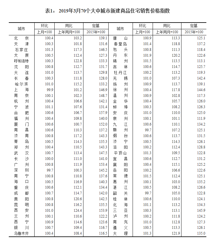 2019年3月份70個(gè)大中城市商品住宅銷售價(jià)格變動(dòng)情況