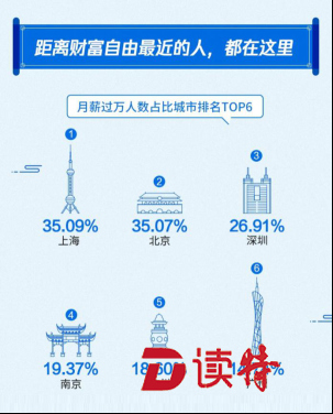 深圳特區(qū)報2019年4月23日訊 月薪過萬人數(shù)占比城市排名 TOP6:上海、北京、深圳、南京、杭州、廣州;其中,北上廣深受訪者中月薪在5000至8000元人數(shù)居多;薪酬水平最高的三個行業(yè)分別是:互聯(lián)網(wǎng)、房地產(chǎn)、金融;受訪者中工作10年月薪過萬人數(shù)不足三成、過六成受訪者工資不及預(yù)期、逾七成受訪者因?yàn)楣べY考慮跳槽;五成受訪者用于理財?shù)腻X不足工資20%、近五成受訪者在第三方互聯(lián)網(wǎng)理財平臺進(jìn)行工資理財。