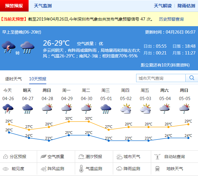 深圳新聞網(wǎng)2019年4月25日訊(記者 陳婕)深圳已經(jīng)于2019年4月14日正式入夏,然而深圳夏季平均季長達(dá)196天,現(xiàn)在都覺得熱了?還差得久呢!不過26-27日將會(huì)進(jìn)入雷雨模式,短時(shí)強(qiáng)降雨的同時(shí)還伴有雷暴和短時(shí)大風(fēng)。本周唯一一天的周六假期要在雨中度過,另外五一假期還有一次強(qiáng)降雨過程。