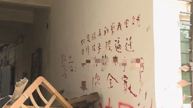 對方還將一樓大門上鎖,用建筑垃圾堵住了樓道,還在樓道墻壁上寫下了不少拒不搬離的文字。