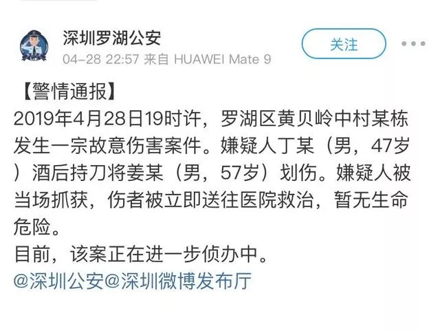 據(jù)記者了解,嫌疑人被當(dāng)場(chǎng)抓獲,傷者被立即送往醫(yī)院救治暫無生命危險(xiǎn)。羅湖公安也發(fā)布了警情通報(bào),行兇者是酒后持刀傷人,警方通報(bào)如下: