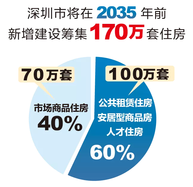 市住建局相關(guān)負(fù)責(zé)人介紹,2018年8月,市政府出臺了《關(guān)于深化住房制度改革加快建立多主體供給多渠道保障租購并舉的住房供應(yīng)與保障體系的意見》(以下簡稱“主文件”)。新時(shí)代,深圳市將針對不同收入水平的居民和專業(yè)人才等各類群體,著力構(gòu)建多層次、差異化、全覆蓋的住房供應(yīng)與保障體系,努力實(shí)現(xiàn)全體市民住有所居?!爸魑募碧岢錾钲谑袑⒃?035年前新增建設(shè)籌集170萬套住房,其中:市場商品住房70萬套,占40%左右;公租房、安居型商品房和人才住房共100萬套,占60%左右。