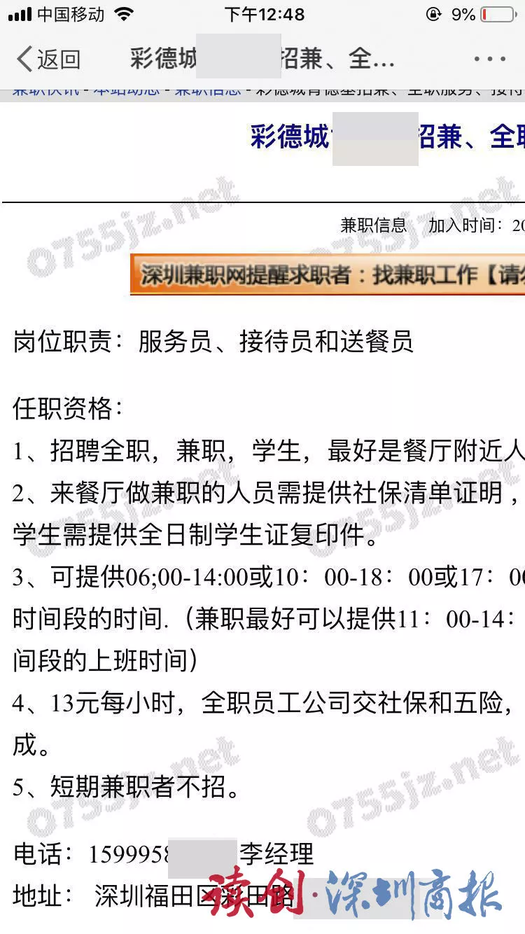 4月8日晚間,江女士在微博搜索“撿手機者”電話號碼,在深圳某知名連鎖餐廳發(fā)布的招聘信息中,無意中發(fā)現(xiàn)其的聯(lián)系電話。