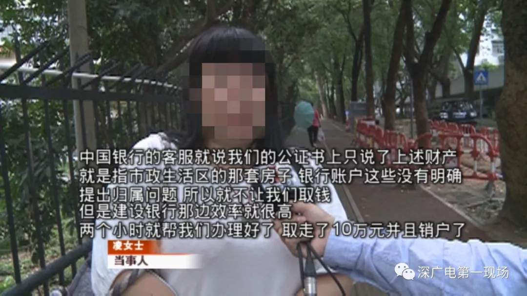 建設(shè)銀行賬戶的10萬元,凌女士和婆婆周女士拿著相關(guān)資料,順利取款并做了銷戶處理。但是她們?nèi)サ街袊y行福田支行時,卻被銀行柜臺以公證書中未明確銀行賬戶歸屬為由,拒絕辦理取款銷戶業(yè)務(wù)。