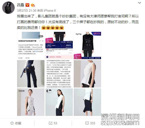 無(wú)獨(dú)有偶。5月5日,深圳影兒時(shí)尚集團(tuán)(以下簡(jiǎn)稱(chēng):影兒集團(tuán))正式向深圳市中級(jí)人民法院提起訴訟請(qǐng)求,就超模呂燕多次在微博上指責(zé)影兒集團(tuán)是“抄抄集團(tuán)”,造成影兒集團(tuán)重大名譽(yù)損失和巨額經(jīng)濟(jì)損失一事,起訴超模呂燕及其公司上海是你商貿(mào)有限公司不正當(dāng)競(jìng)爭(zhēng),要求兩被告立即停止侵權(quán)行為,賠償經(jīng)濟(jì)損失1000萬(wàn)元,并公開(kāi)道歉。