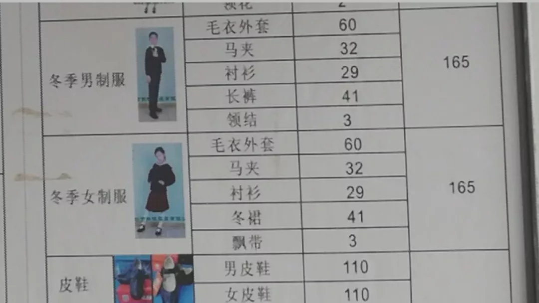 從龐女士發(fā)過(guò)來(lái)的圖片中記者看到,此前這家店的校服價(jià)格表中,小學(xué)學(xué)生冬季制服價(jià)格為165元。