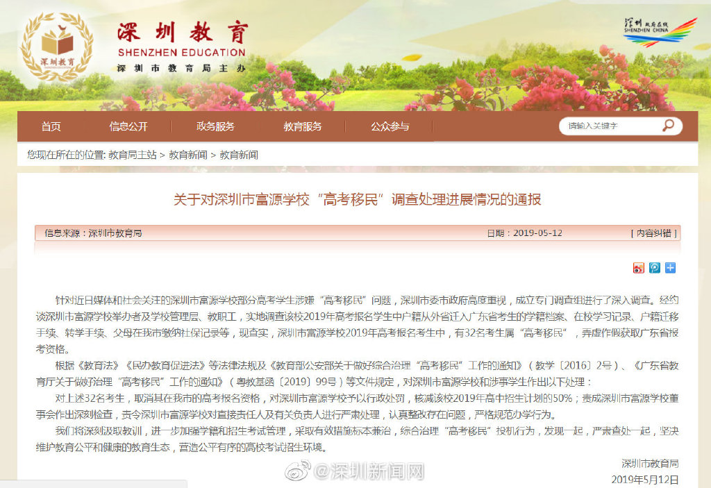 針對近日媒體和社會關(guān)注的深圳市富源學(xué)校部分高考學(xué)生涉嫌“高考移民”問題,深圳市委市政府高度重視,成立專門調(diào)查組進行了深入調(diào)查。經(jīng)約談深圳市富源學(xué)校舉辦者及學(xué)校管理層、教職工,實地調(diào)查該校2019年高考報名學(xué)生中戶籍從外省遷入廣東省考生的學(xué)籍檔案、在校學(xué)習(xí)記錄、戶籍遷移手續(xù)、轉(zhuǎn)學(xué)手續(xù)、父母在我市繳納社保記錄等,現(xiàn)查實,深圳市富源學(xué)校2019年高考報名考生中,有32名考生屬“高考移民”,弄虛作假獲取廣東省報考資格。