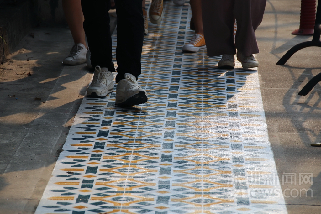 開幕前,藝術(shù)家邀請公眾與志愿者共同完成花磚涂鴉作品《安全地帶》(主辦方供圖)
