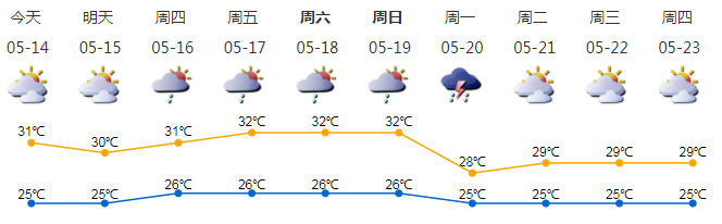 我市多云,早晚有輕霧;氣溫25-31℃;偏南風2-3級;相對濕度55%-95%