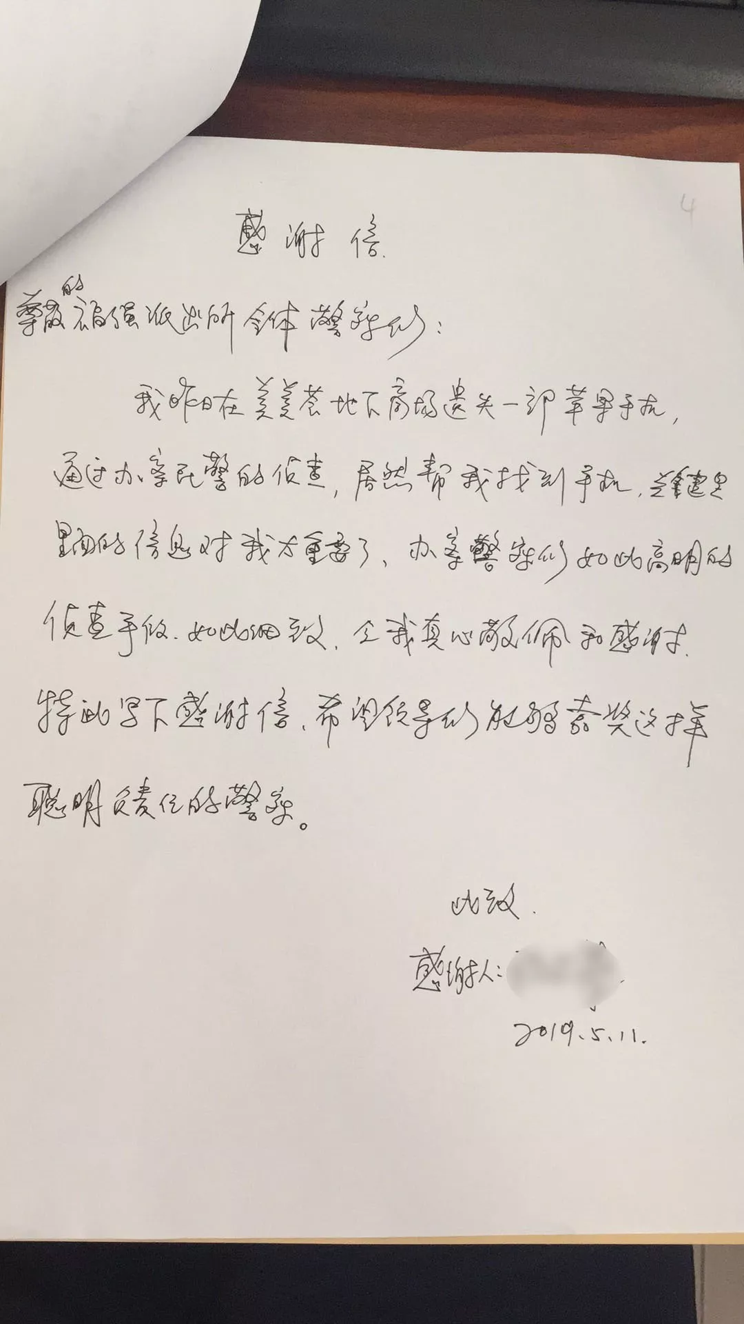 “手機(jī)里面的信息太重要了,辦案警察們?nèi)绱烁呙鞯膫刹槭侄?,如此?xì)致,令我真心敬佩和感謝!”5月11日晚,程女士在福強(qiáng)派出所的前臺激動地手寫了這封感謝信。