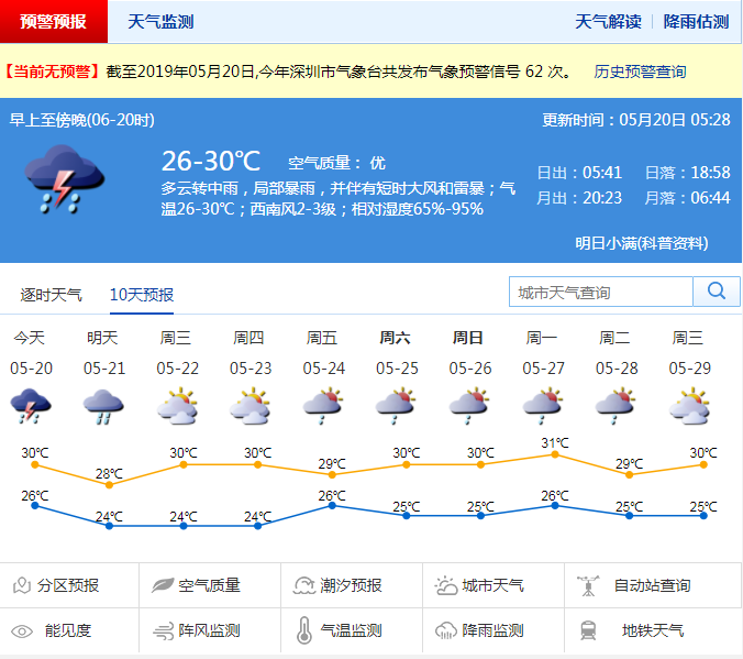 一年一度的“5·20”又來了,深圳近年來5月20日當天局部暴雨以上的降雨的風險較高。果然,受冷空氣影響,今天白天全市有降雨,局部地區(qū)降雨量級可達到大雨到暴雨,并伴有雷暴和8級左右短時大風,天氣較劇烈,雷雨過程恰逢周一上班,市民注意合理安排出行。氣溫在25℃-29℃,高溫暴曬天氣緩解。