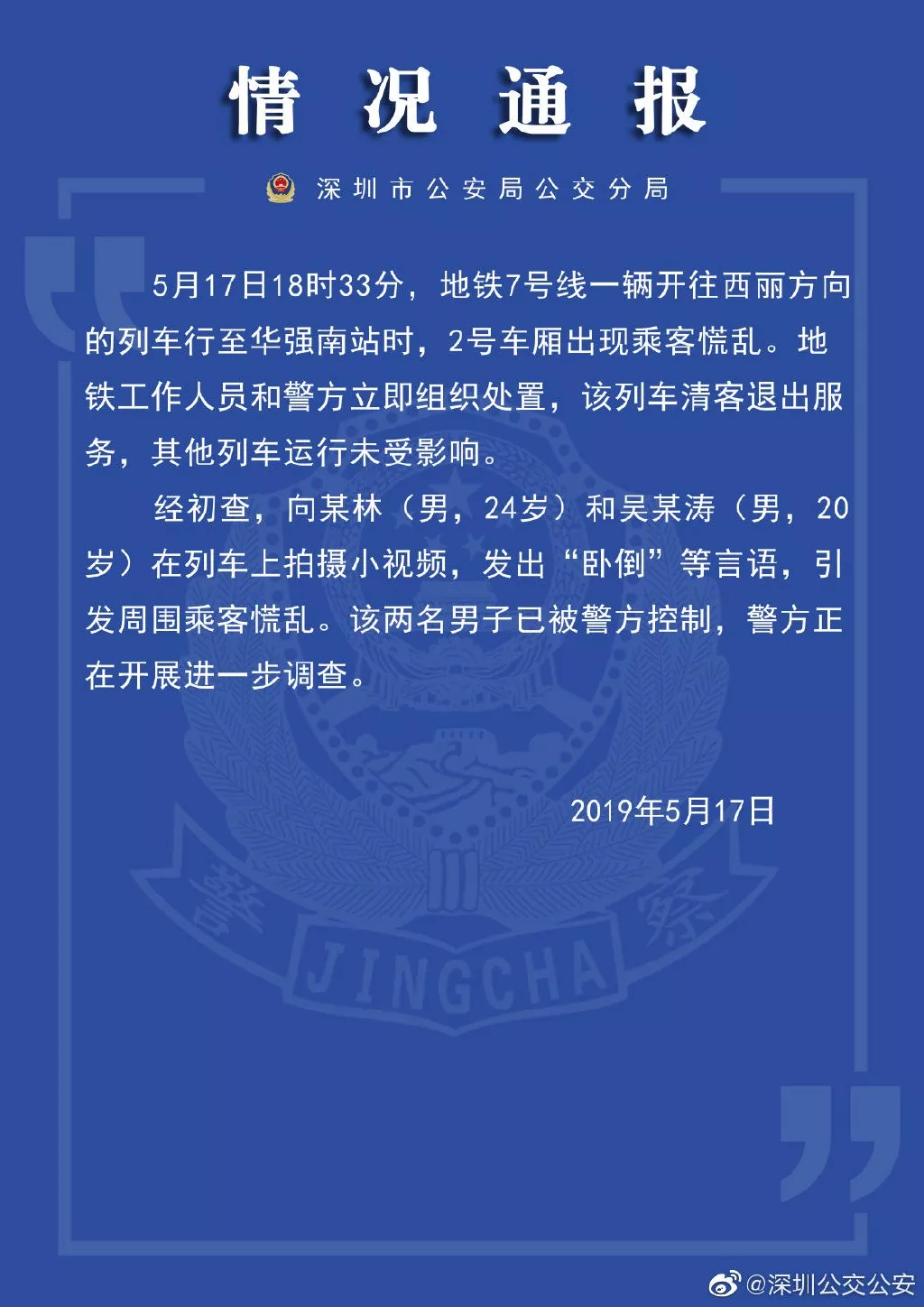 深圳公交公安前日晚間通報