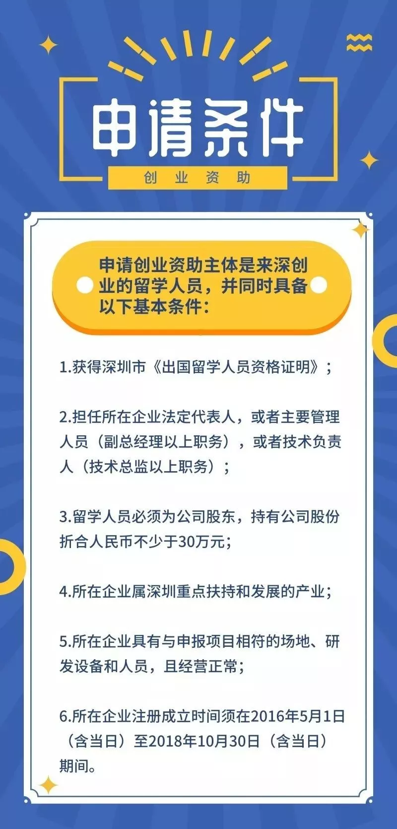2.申請人或者申報單位曾獲得深圳市科技主管部門發(fā)放的科技研發(fā)資金中的留學(xué)人員創(chuàng)業(yè)資助、海外高層次人才創(chuàng)新創(chuàng)業(yè)資助等。