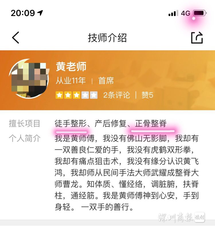涉事黃師傅在美團上介紹顯示為首席技師,其從業(yè)11年,擅長項目為徒手整形、產(chǎn)后修復(fù)、正骨整脊。值得注意的是,該店在美團上評價為五星滿分。