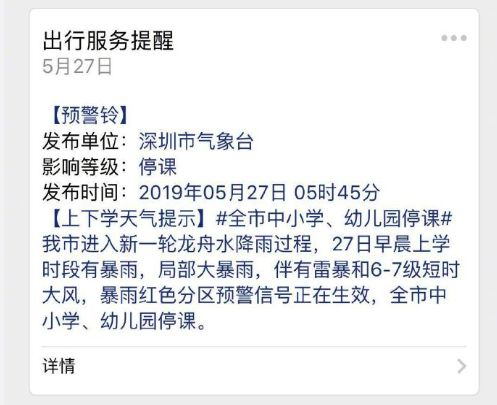 5月27日5時45分,深圳天氣微信公眾號發(fā)布出行服務提醒:深圳進入新一輪龍舟水降雨過程,27日早晨上學時段有暴雨,局部大暴雨,暴雨紅色預警信號正在生效全市中小學、幼兒園停課。