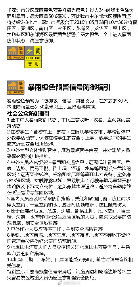 【深圳市分區(qū)暴雨黃色預(yù)警升級(jí)為橙色】過去3小時(shí)我市普降大雨到暴雨,最大雨量50.6毫米,預(yù)計(jì)我市中東部地區(qū)強(qiáng)降雨還將持續(xù)2-3小時(shí),深圳市氣象臺(tái)于2019年05月28日10時(shí)30分將福田區(qū),羅湖區(qū),南山區(qū),鹽田區(qū),龍崗區(qū),龍華區(qū),坪山區(qū),大鵬新區(qū)和東部海區(qū)暴雨黃色預(yù)警升級(jí)為橙色,全市進(jìn)入暴雨防御狀態(tài),請(qǐng)注意防御。