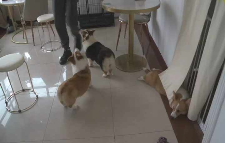 根據(jù)小區(qū)業(yè)主指引,記者來到小區(qū)13層的一家狗狗咖啡廳,可以看到,門口并沒有任何招牌,不過大門打開后,可以看到經(jīng)營場所有兩層,里面有餐桌凳子,有收銀臺(tái),另外還有四只小型寵物犬。