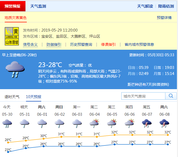 深圳新聞網(wǎng)5月30日訊 從上周開始,天氣預報就不斷提示:小雨、雷陣雨、暴雨。掐指一算,“龍舟水”又到了。深圳市氣象臺預計,31日-6月3日,多云間陰天,有中到大雨。深圳人,你們最近可能真的需要一艘船!