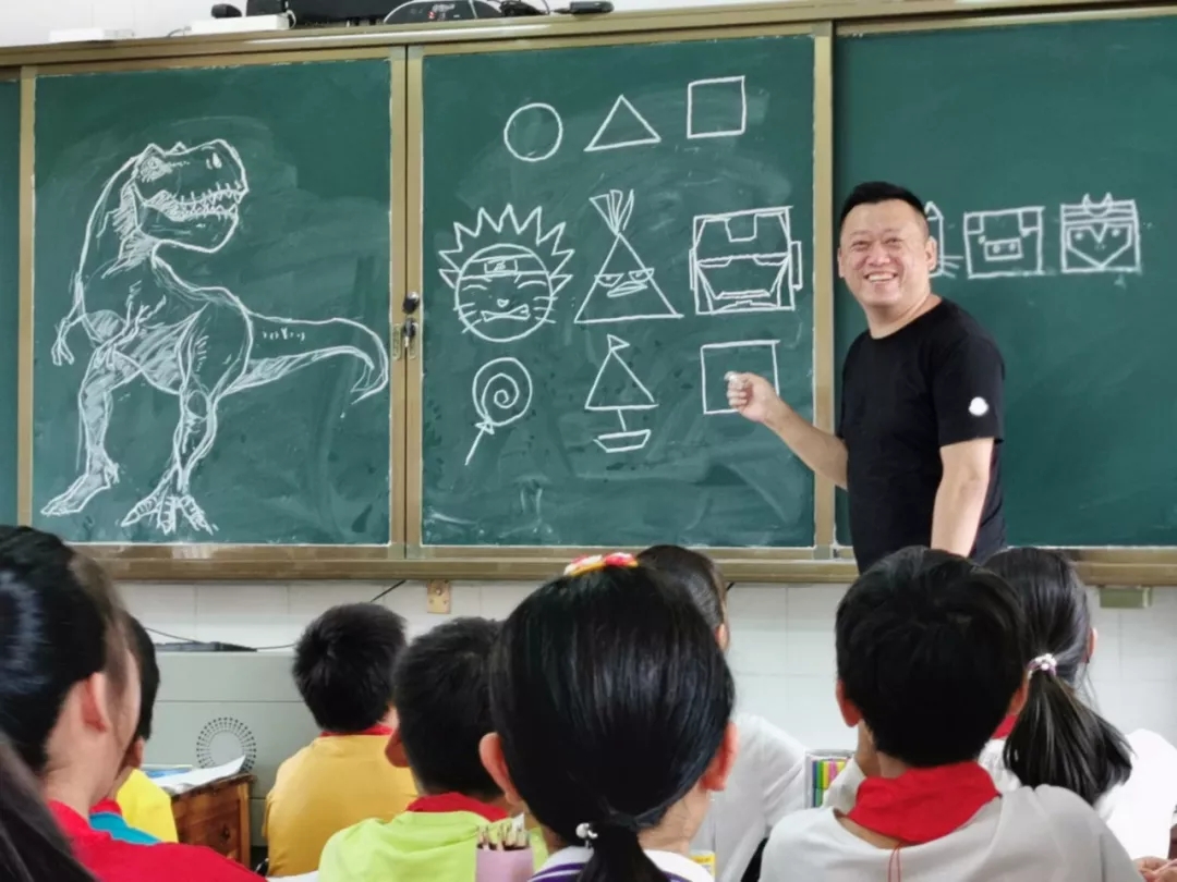 同學(xué)們?cè)谙旅娌碌脽峄鸪?,李老師卻一言不發(fā),繼續(xù)涂涂畫(huà)畫(huà),漸漸的圖像露出了真容,一只栩栩如生的大恐龍出現(xiàn)在黑板上,教室里的小家伙們發(fā)出一聲聲驚嘆: