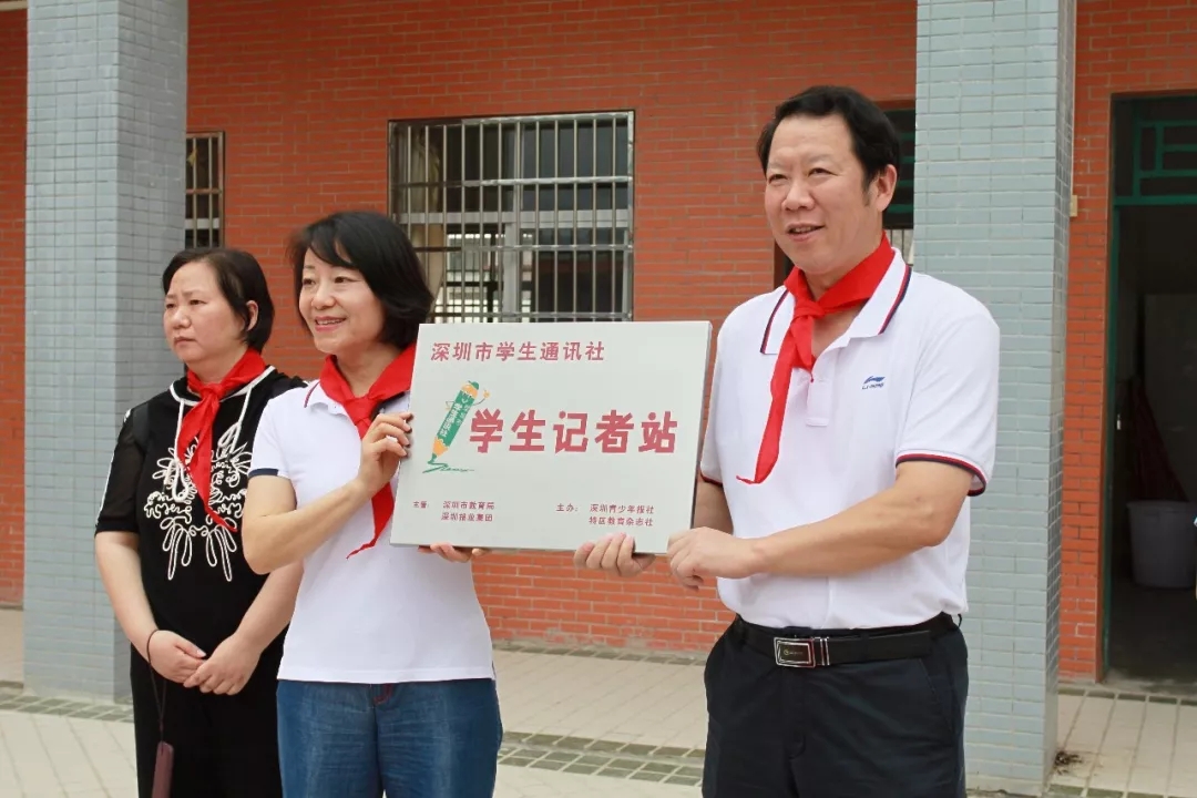 在捐贈儀式上,同學(xué)們?yōu)檫h(yuǎn)道而來的叔叔阿姨系上了紅領(lǐng)巾,這些“大紅領(lǐng)巾”陪著“小紅領(lǐng)巾”,提前歡慶六一兒童節(jié)的到來。總社還為雅色的孩子帶來一份大禮,那就是深圳學(xué)通社學(xué)生記者站在頌平小學(xué)掛牌。