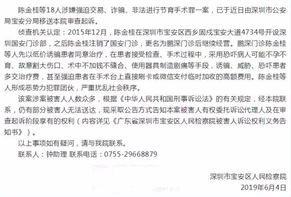 最近,寶安區(qū)人民檢察院就發(fā)布了一起案件公告,當(dāng)中顯示寶安區(qū)西鄉(xiāng)鵬深門(mén)診在病患接受檢查、手術(shù)治療過(guò)程中,為獲取不法利益,采用“惡意夸大病情、故意割大傷口及使用器具制造疼痛”等手段,誘騙、威脅、恐嚇患者多交治療費(fèi),近日鵬深門(mén)診18人被起訴。