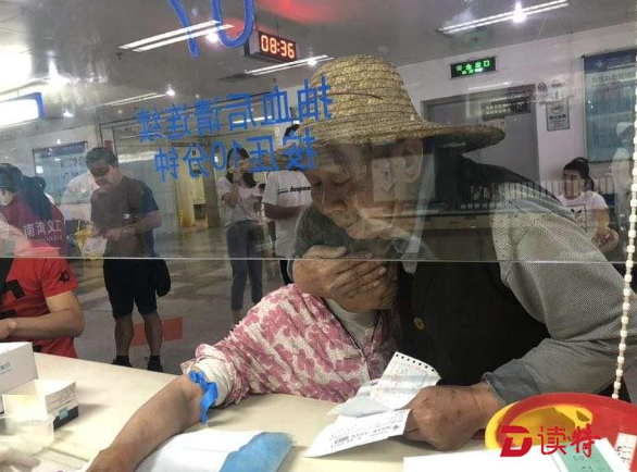 一名七旬老人陪老伴抽血檢查時(shí),因?yàn)閾?dān)心其暈血,老人貼心地?fù)肀Ю习椋€捂住其眼睛不讓其看抽血。