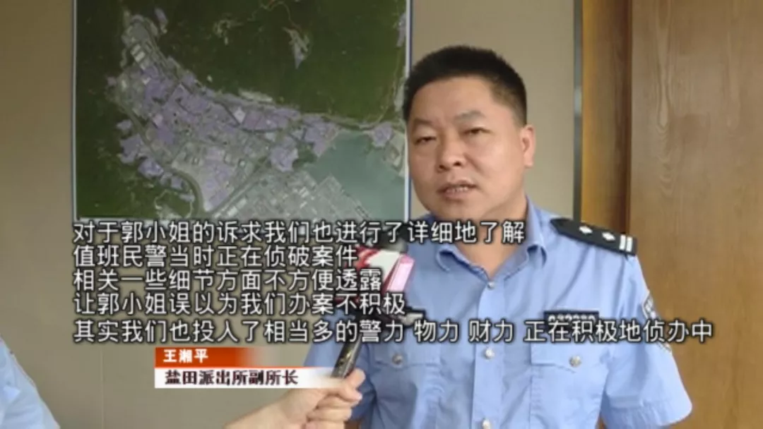 派出所表示,案件正在偵查當中記者也和郭女士來到鹽田派出所,由于負責此案的蔡警官正值休假,派出所的一位值班領導,對郭女士當時所遭遇的處境,進行了情況說明。
