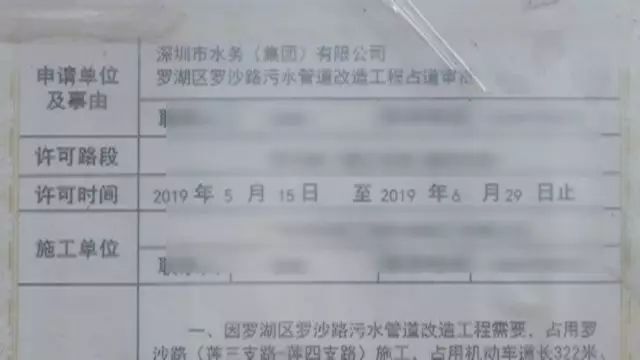 現(xiàn)場的一份施工告知書顯示,正在施工的這項(xiàng)工程,屬于水務(wù)集團(tuán)羅沙路污水管道改造工程,獲得了占用道路挖掘許可。工程周期從5月15日開始到6月29日截止,一共45天。