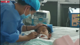 ICU病房里最后一次團聚,媽媽不停給和和擦拭臉,不時低下頭親吻和和,抬頭有晶瑩的淚珠滴落。青島早報視頻截圖
