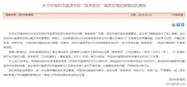 5月12日晚,深圳市教育局發(fā)布《關(guān)于對(duì)深圳市富源學(xué)校“高考移民”調(diào)查處理進(jìn)展情況的通報(bào)》,通報(bào)稱,經(jīng)查實(shí),深圳市富源學(xué)校2019年高考報(bào)名考生中,有32名考生屬“高考移民”,弄虛作假獲取廣東省報(bào)考資格。按照相關(guān)法例,對(duì)涉事32名學(xué)生取消在深圳市的高考報(bào)名資格,對(duì)深圳市富源學(xué)校予以行政處罰,核減該校2019年高中招生計(jì)劃的50%;責(zé)成深圳市富源學(xué)校董事會(huì)作出深刻檢查,責(zé)令深圳市富源學(xué)校對(duì)直接責(zé)任人及有關(guān)負(fù)責(zé)人進(jìn)行嚴(yán)肅處理,認(rèn)真整改存在問題,嚴(yán)格規(guī)范辦學(xué)行為。