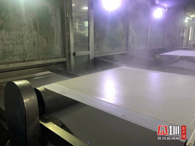 經(jīng)過110攝氏度以上的高溫蒸煮后,米漿變成熟化的米片,等待切條。