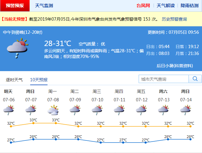 深圳新聞網(wǎng)2019年7月5日訊 第4號臺風“木恩”(熱帶風暴級)已經(jīng)于4日早上登陸越南北部沿海,對深圳影響減弱。據(jù)深圳市氣象局消息,今日深圳多云間陰天,有短時陣雨或雷陣雨;氣溫28-31℃;