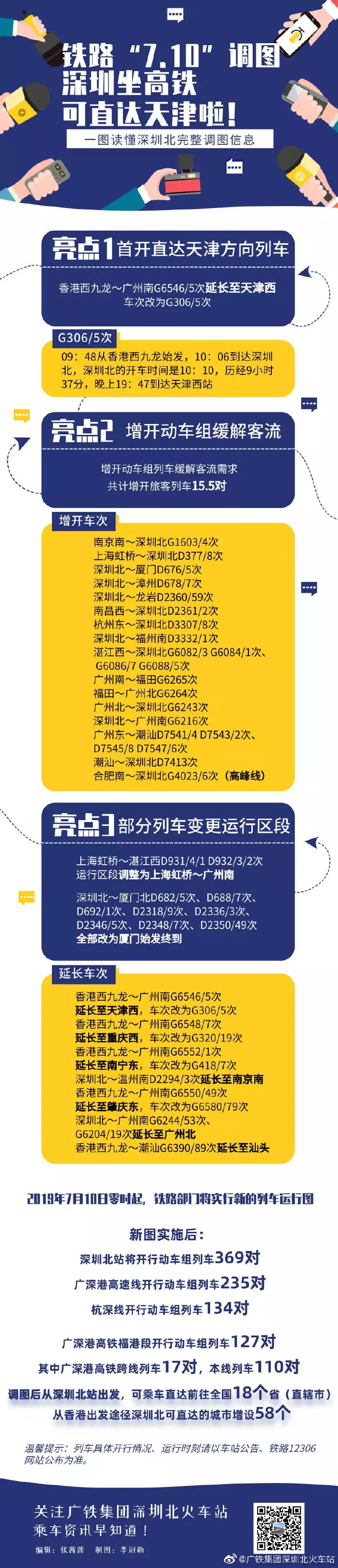 根據(jù)新的運行圖安排,深圳北站將開行動車組列車369對,廣深港高速線開行動車組列車235對;杭深線開行動車組列車134對?!?·10”調(diào)圖后,深圳北站首開前往天津方向列車,屆時從深圳北站出發(fā),可乘車直達前往全國18個?。ㄖ陛犑校?;從香港出發(fā)途徑深圳北可直達的城市增設(shè)58個。