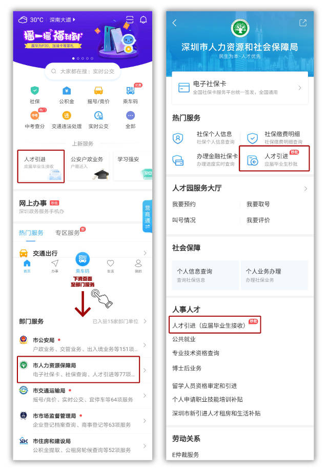 在“i深圳”APP首頁下拉至“部門服務(wù)”列表,進(jìn)入深圳市人力資源保障局專區(qū),然后選擇“人才引進(jìn)”。