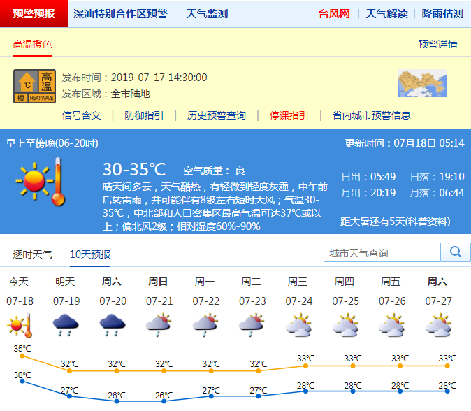 深圳新聞網(wǎng)2019年7月18日訊 受臺(tái)風(fēng)“丹娜絲”外圍下沉氣流影響,昨日我市高溫天氣加劇,全市最高39℃,出現(xiàn)在羅湖區(qū)東湖街道。市氣象臺(tái)于昨日14時(shí)30分將全市高溫黃色預(yù)警信號(hào)升級(jí)為橙色。這也是今年我市首個(gè)高溫橙色預(yù)警信號(hào)。