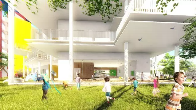 項目打破傳統(tǒng)整齊排列的布局方式,打造出4個與邊界呼應(yīng)的靈活體塊,在保證幼兒園首層活動空間完整最大化的同時,將新舊校舍結(jié)合,打造一個聯(lián)通式共享庭院。新建校舍為每一個班級都提供了專屬的室內(nèi)外無邊界活動空間。除首層班級與室外活動空間直接連通以外,二、三層班級外設(shè)有錯落的活動露臺及挑檐,實現(xiàn)每層均可嬉戲、游樂、探索的布局。