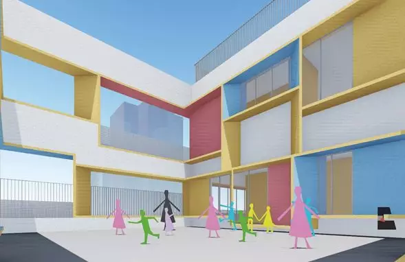 項(xiàng)目用地緊張且形狀不規(guī)則,與周邊建筑距離較近。在被3小時(shí)日照線及周邊建筑最近點(diǎn)的18米范圍線切割的用地上布置幼兒生活用房,同時(shí)保證主要的幼兒生活用房(即班級活動單元)南向采光。在滿足功能需求的前提下,首層最大范圍的架空,并與室外活動場地、綠地形成一體,南北連通,為幼兒提供開敞的室外活動空間。