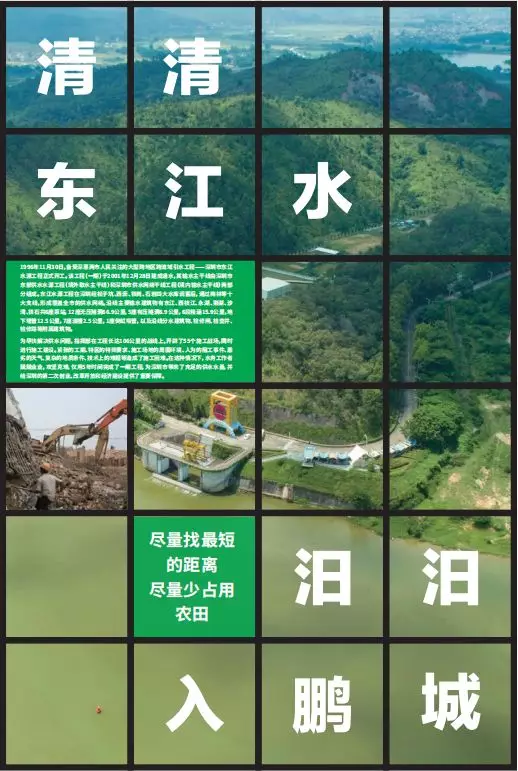 第三部分“清清東江水汩汩入鵬城”,著重展示東江水源工程建設的全過程。以工程線路為展覽線索,再現(xiàn)水務工作者在長達106公里的戰(zhàn)線上奮戰(zhàn)的場面。通過輸水設施的新舊照片對比,描繪出一條在深惠兩城平地崛起的深圳“生命線”。