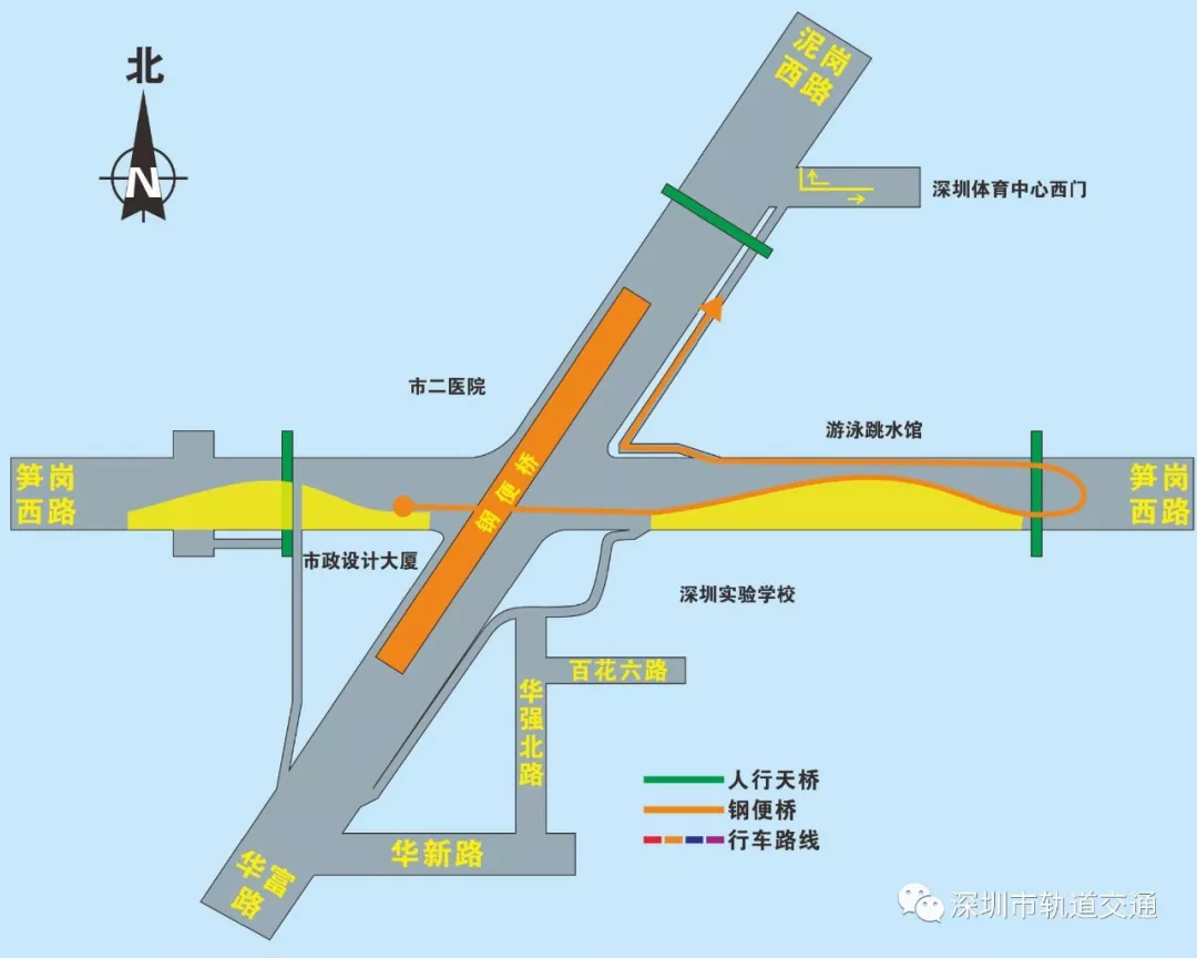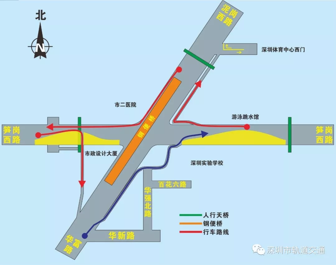 在本次調(diào)整中,華富路-泥崗西路南北向交通只能通過鋼便橋雙向六車道行車。泥崗西路、華富路、筍崗西路左轉(zhuǎn),行人線路及“市二醫(yī)院”,“體育館”公交站臺均有所調(diào)整。