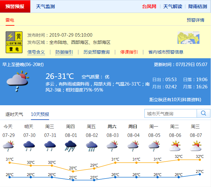 見圳客戶端·深圳新聞網2019年7月29日訊 今天多云有雷陣雨,局部大雨;26-31℃;南風2-3級;濕度75%-95%。預計30-31日陰天間多云,有雷陣雨,局部暴雨;8月1日-2日有一次暴雨降雨過程;8月3日-5日降雨減弱,多云有陣雨或雷陣雨。