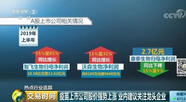 在已經(jīng)公布的2019年半年度業(yè)績中:智飛生物歸母凈利潤10.58億元~12.62億元,同比增長55%~85%;沃森生物凈利潤約8100萬元~9600萬元,同比增長11%~31%;康泰生物歸母凈利潤為:2.7億元,同比下降15%-5%。