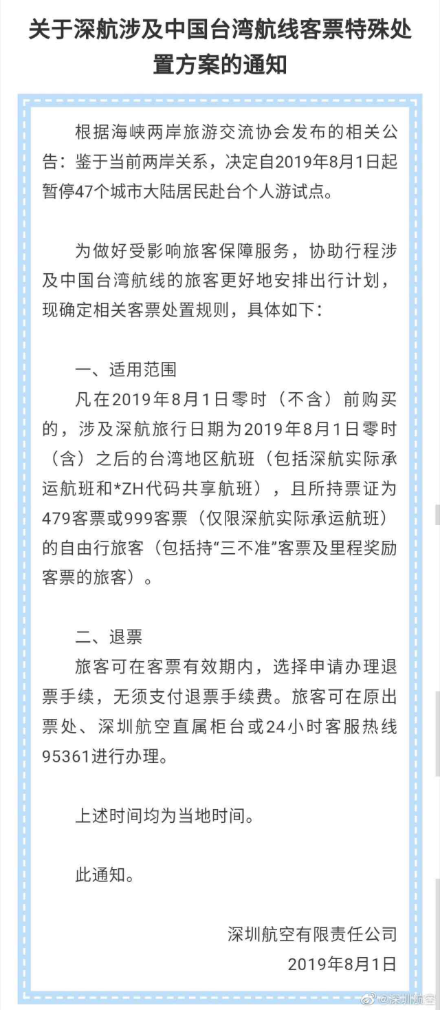 深圳航空剛剛率先發(fā)布了關(guān)于深航涉及中國臺灣航線客票特殊處置方案的通知,凡在2019年8月1日零時(不含)前購買的,涉及深航旅行日期為2019年8月1日零時(含)之后的臺灣地區(qū)航班(包括深航實際承運(yùn)航班和*ZH代碼共享航班),且所持票證為479客票或999客票(僅限深航實際承運(yùn)航班)的自由行旅客(包括持“三不準(zhǔn)”客票及里程獎勵客票的旅客),旅客可在客票有效期內(nèi),選擇申請辦理退票手續(xù),無須支付退票手續(xù)費(fèi)。旅客可在原出票處、深圳航空直屬柜臺或24小時客服熱線95361進(jìn)行辦理。