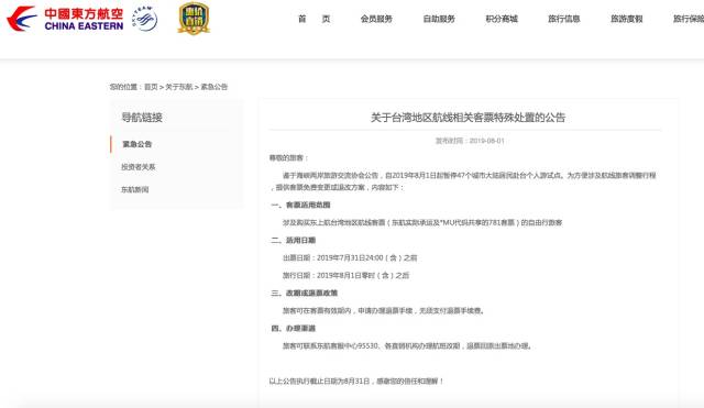 繼深航之后,東航也剛剛發(fā)布了關(guān)于臺(tái)灣地區(qū)航線相關(guān)客票特殊處置的公告:涉及購(gòu)買東航臺(tái)灣地區(qū)航線客票(東航實(shí)際承運(yùn)及*MU代碼共享的781客票)的自由行旅客,出票日期在2019年7月31日24:00(含)之前,旅行日期在2019年8月1日零時(shí)(含)之后的,旅客可在客票有效期內(nèi),申請(qǐng)辦理退票手續(xù),無(wú)須支付退票手續(xù)費(fèi)。
