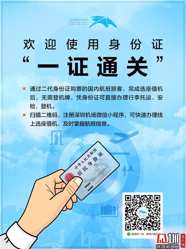深圳新聞網(wǎng)2019年8月1日訊(見圳客戶端、深圳新聞網(wǎng)記者 涂勝 通訊員 葉丹)記者從深圳機場了解到,即日起,深圳機場全面試行國內(nèi)航班身份證“一證通關”服務。今后,使用二代身份證購買機票的旅客,在完成選座值機后,僅需出示身份證即可直接辦理行李托運、安檢和登機手續(xù),全程無需再出示登機牌。
